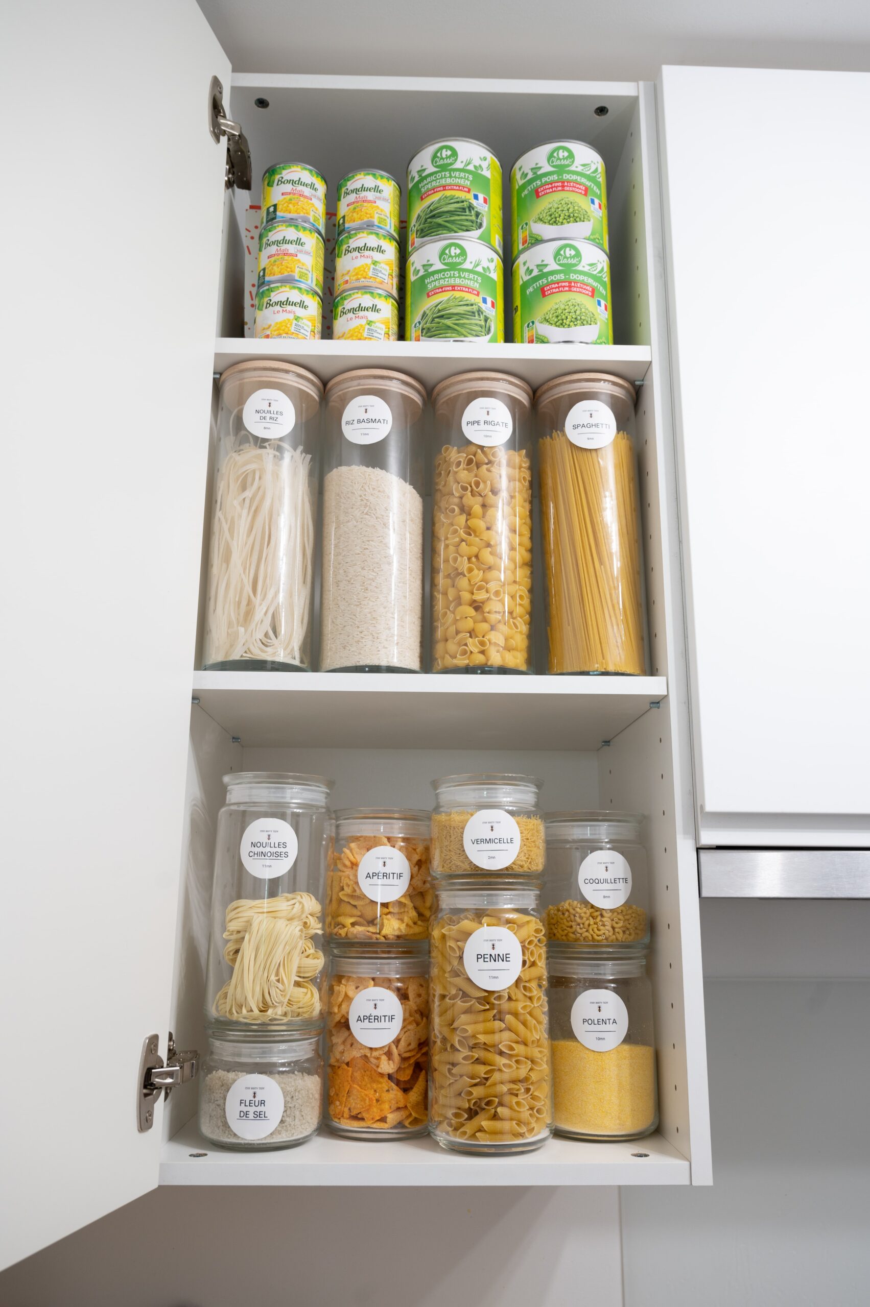 Essayer de faire en sorte de visualiser rapidement tous vos aliments. Mettre les boîtes de profils, regrouper les produits par catégories (produits secs, conserves, épicerie, pâtisserie, petit déjeuner, goûter, boissons), privilégier les tiroirs ou les placards peus profond… Le risque, c’est de racheter le même aliment une énième et de l’oublier comme une vieille chaussette ! Et en bonus, visualiser vos aliments vous permettra d’avoir plus d’inspiration pour cuisiner.