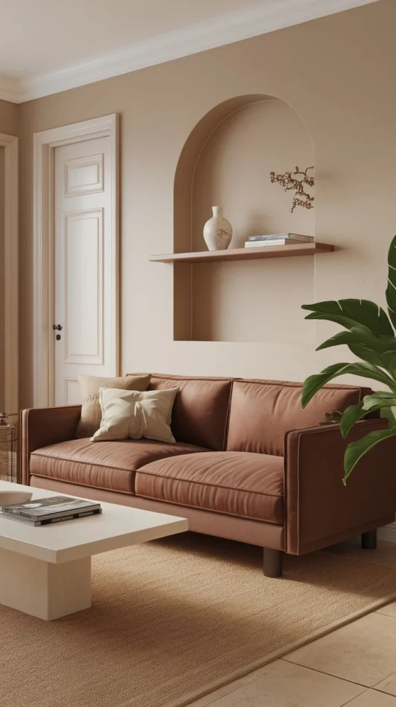 Appliquez Mocha Mousse sur un mur d’accent pour créer un point focal chaleureux dans votre salon ou votre chambre. Associée à des tons neutres comme le blanc cassé ou le gris clair, elle apporte profondeur et sophistication sans alourdir l’espace.