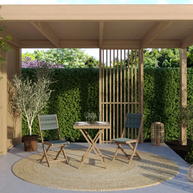 • Un coin détente avec deux fauteuils bas et un tapis d’extérieur